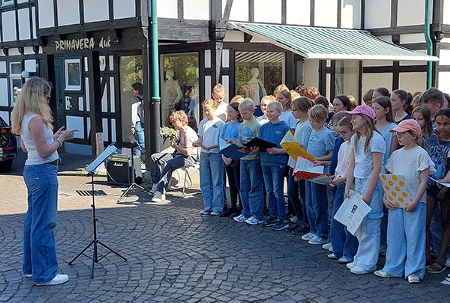 Ein besonders Ereignis für alle Beteiligten war schließlich die Mitgestaltung der Aktion „Klang der Stolpersteine“, an der alle zehn Kooperationsschulen in zehn Bielefelder Stadtteilen zur gleichen Zeit im Mai 2025 Stolpersteine „zum Klingen“ brachten. Vor einem großen Publikum sangen und musizierten die Marienschüler:innen vor der Stiftskirche an den Steinen für die Familie Grünewald und machten so stimmgewaltig auf das Schicksal der deportierten Familie aufmerksam.